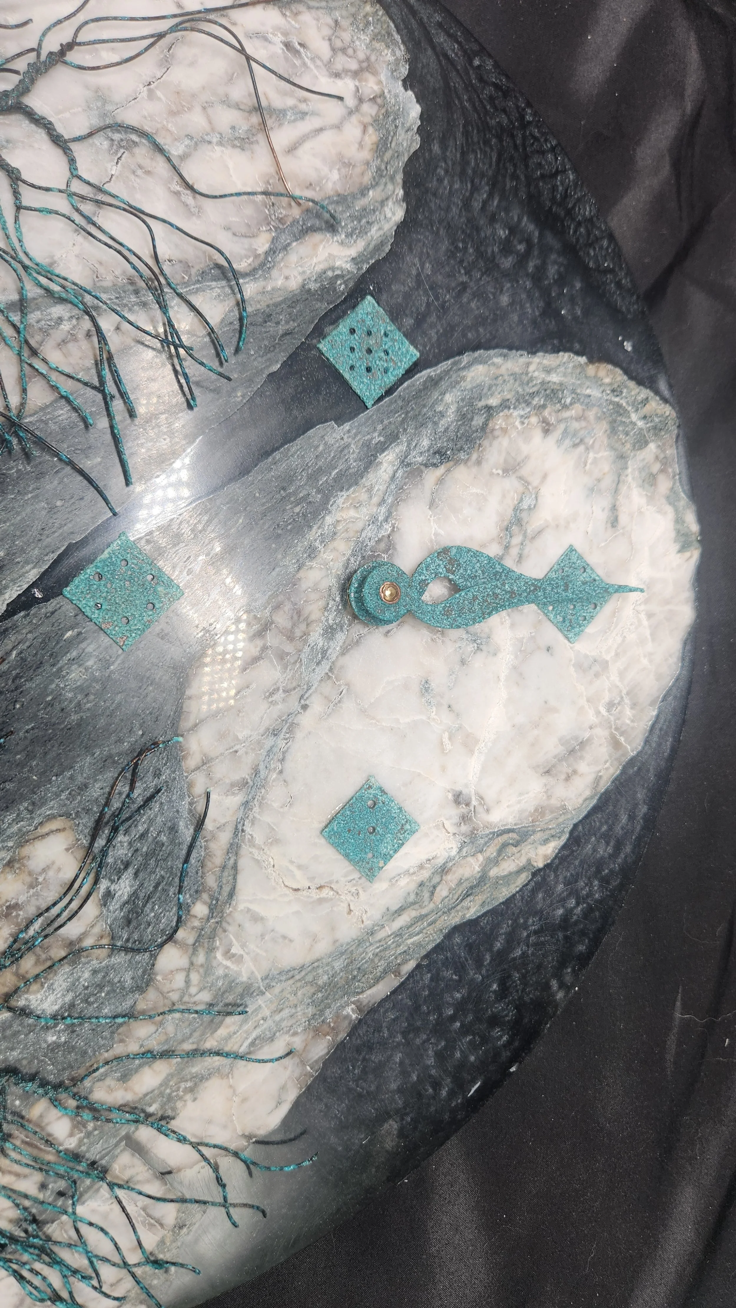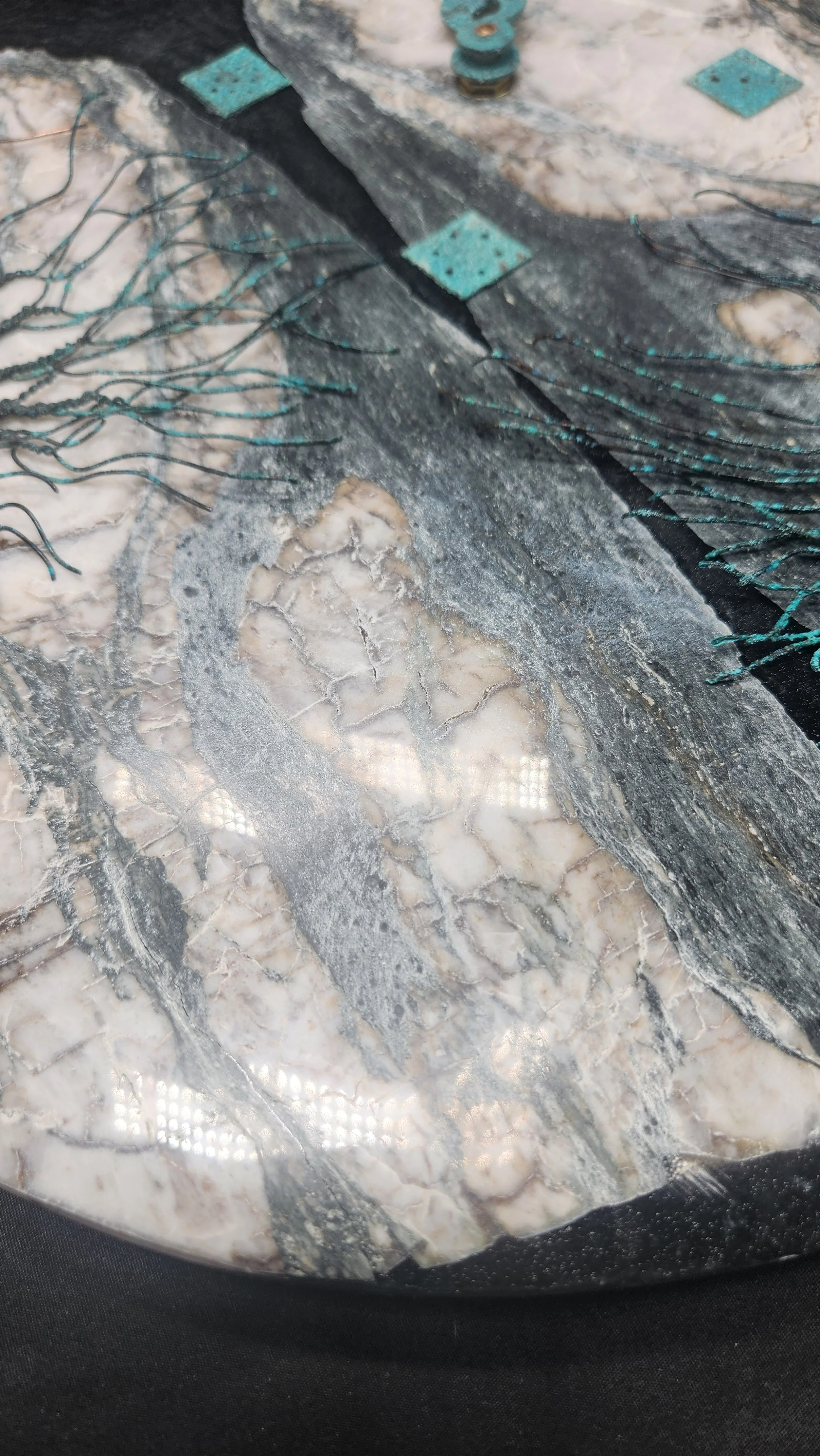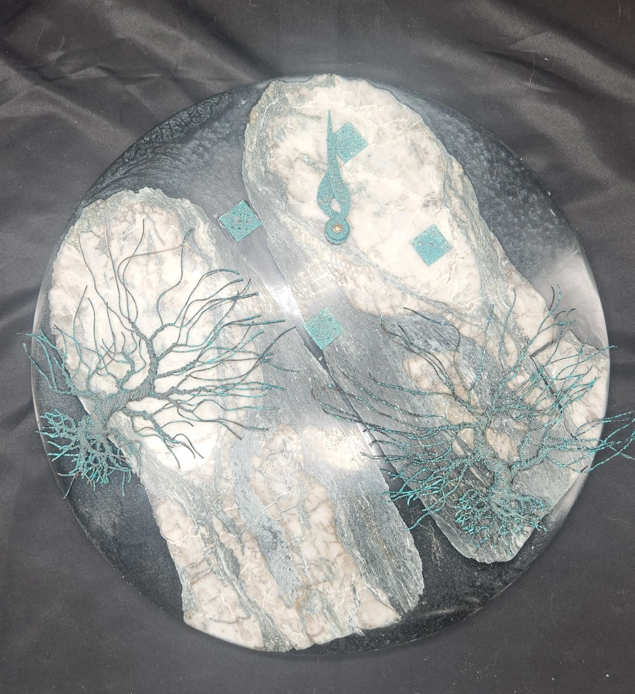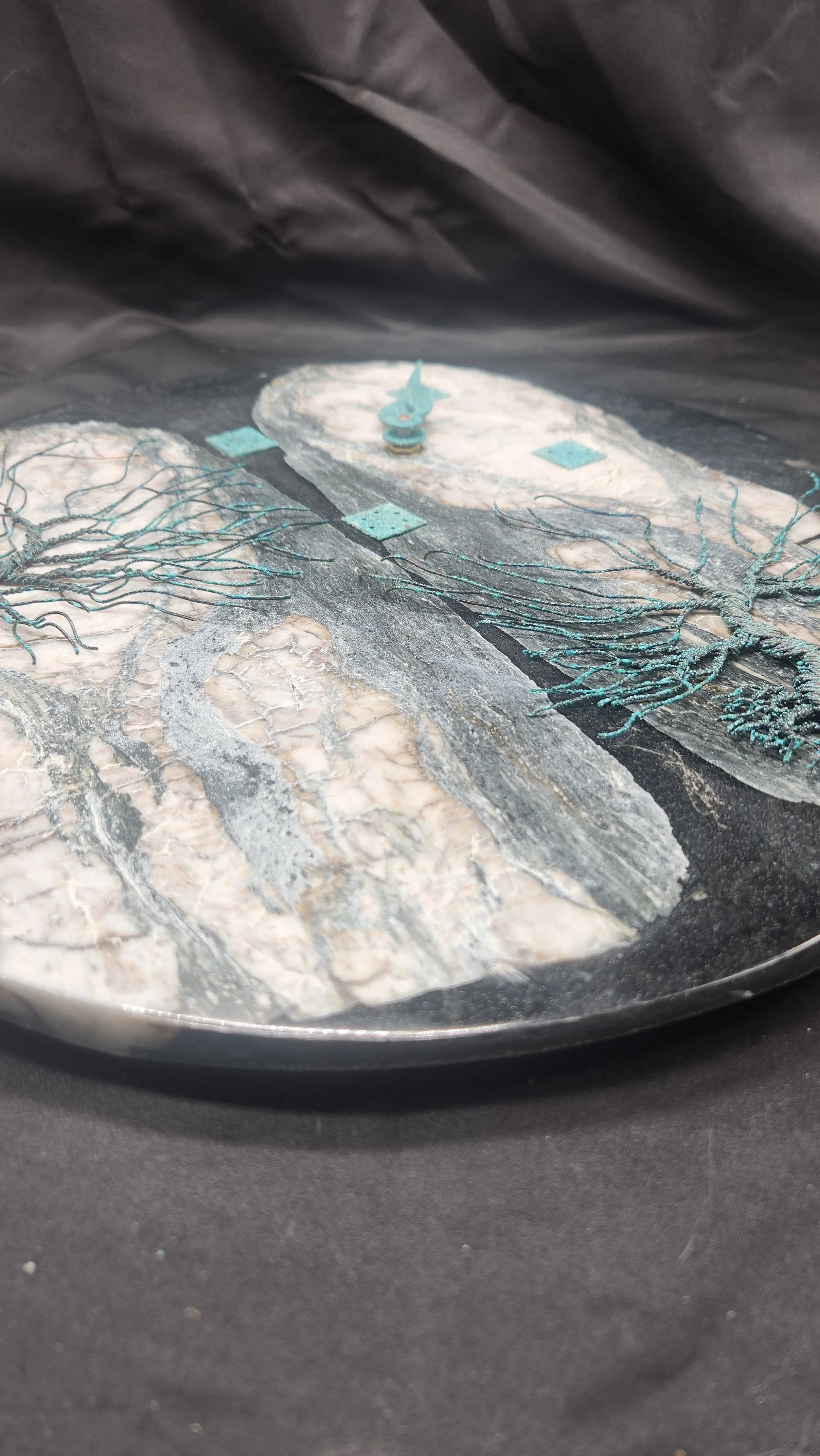 This clock features two green and white marbled, bookmatched stone slices. Bookmatching is a technique used in woodworking and stonework where two or more pieces are cut from the same, in this case, stone and arranged to create a symmetrical, mirror-like pattern. Imagine a stone being cut in half and then opened like a book. These are then rotated slightly to create a contrasting non-symmetrical element to the piece and cast into a 14” round shape with swirling black epoxy. In the spirit of finding animals in clouds, the marbling in to stone reminded me of a women’s face with either long hair or wearing a shawl, and with the two mirrored stones, it looks like two sisters, back to back in a moment of serene contemplation.
