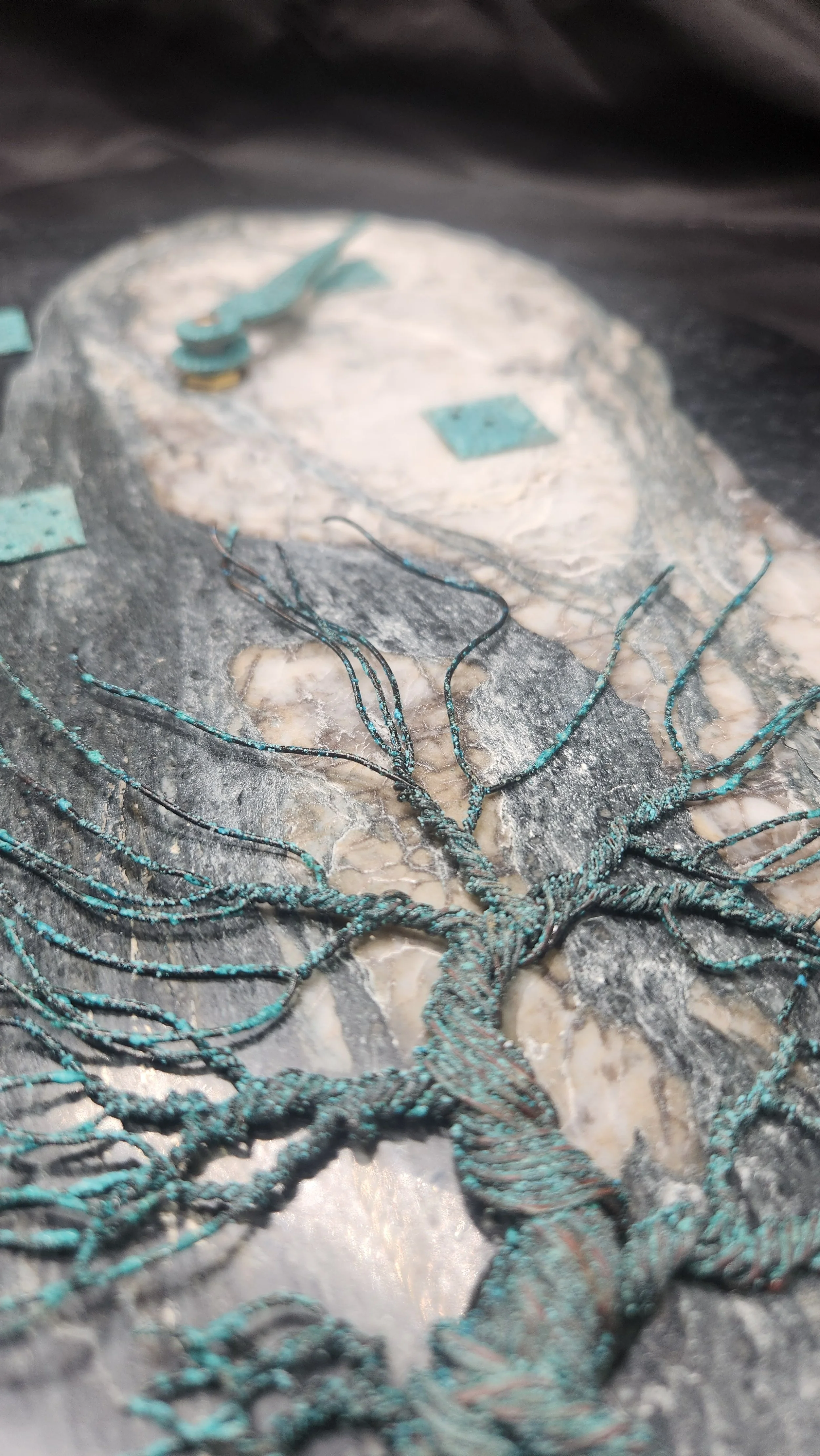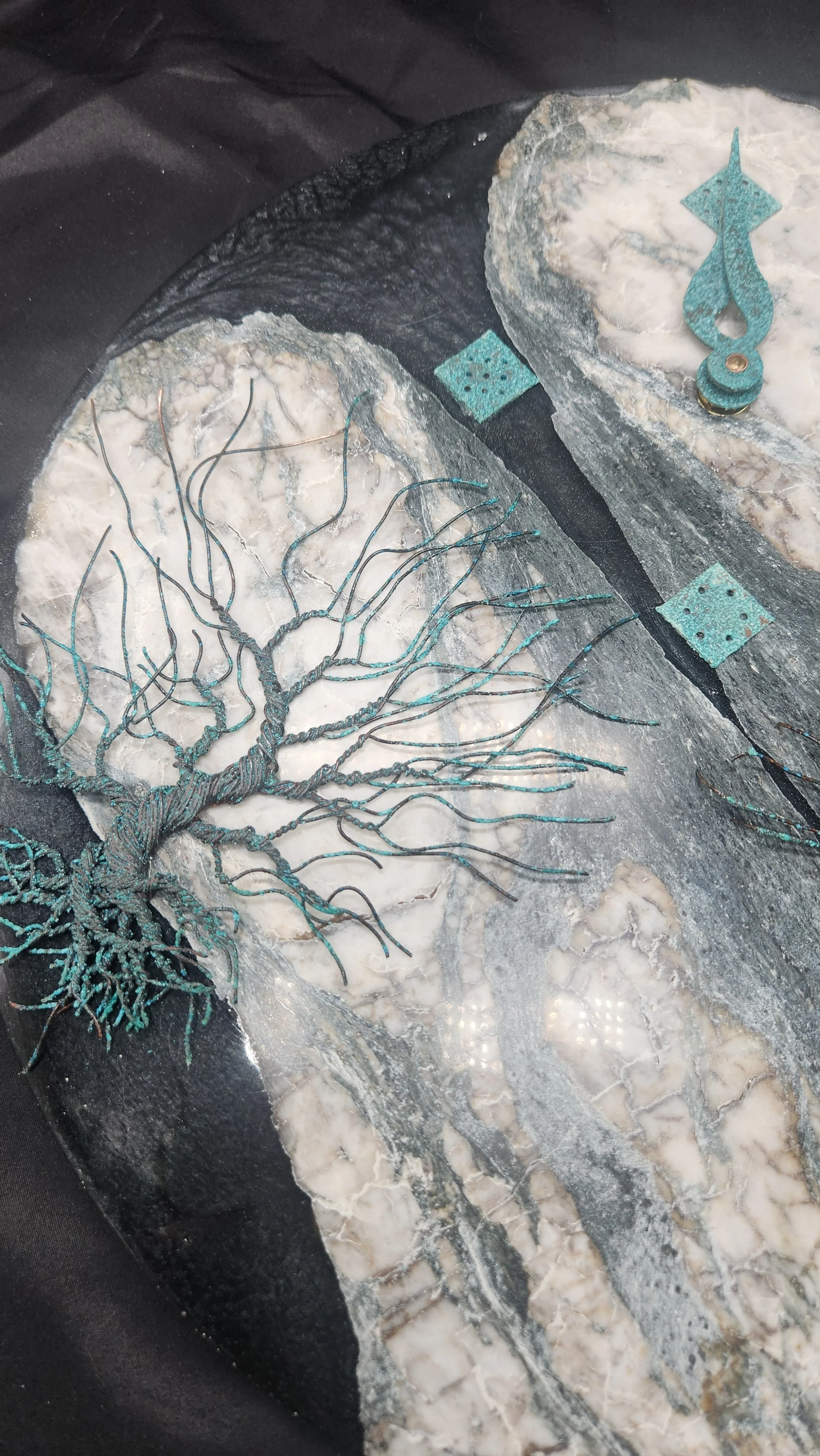 Finishing it off are two 100% solid copper wire, “barren” bonsai trees (no leaves) also with a natural green/blue patina.