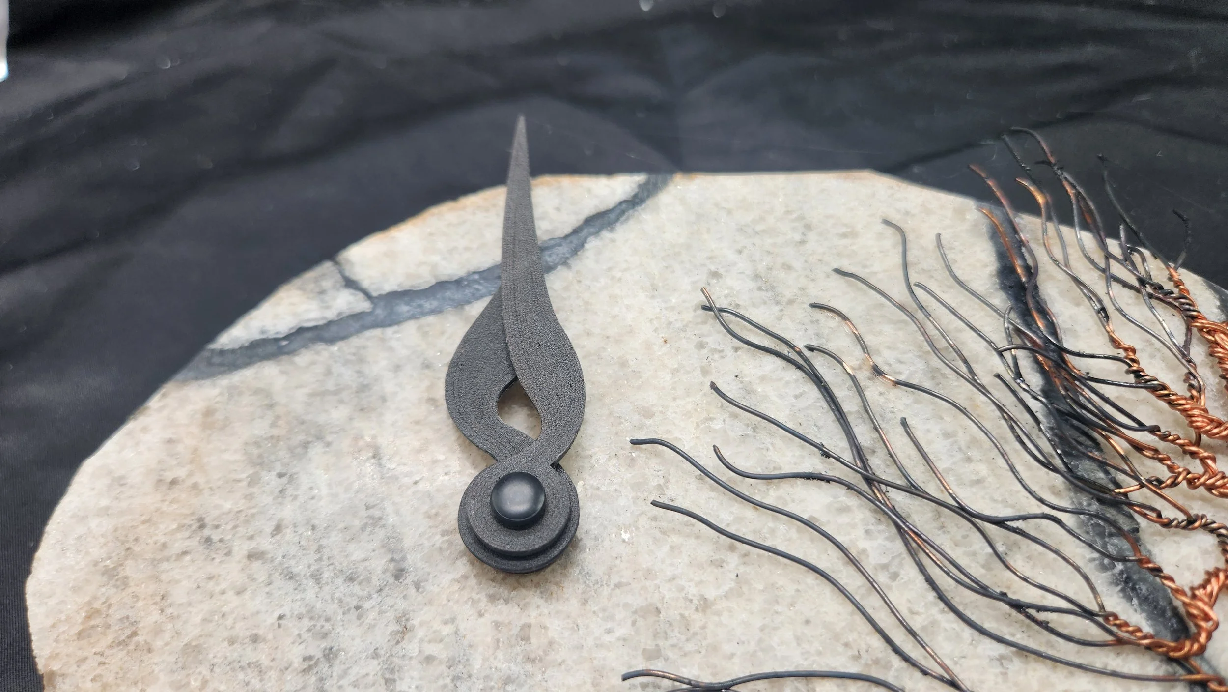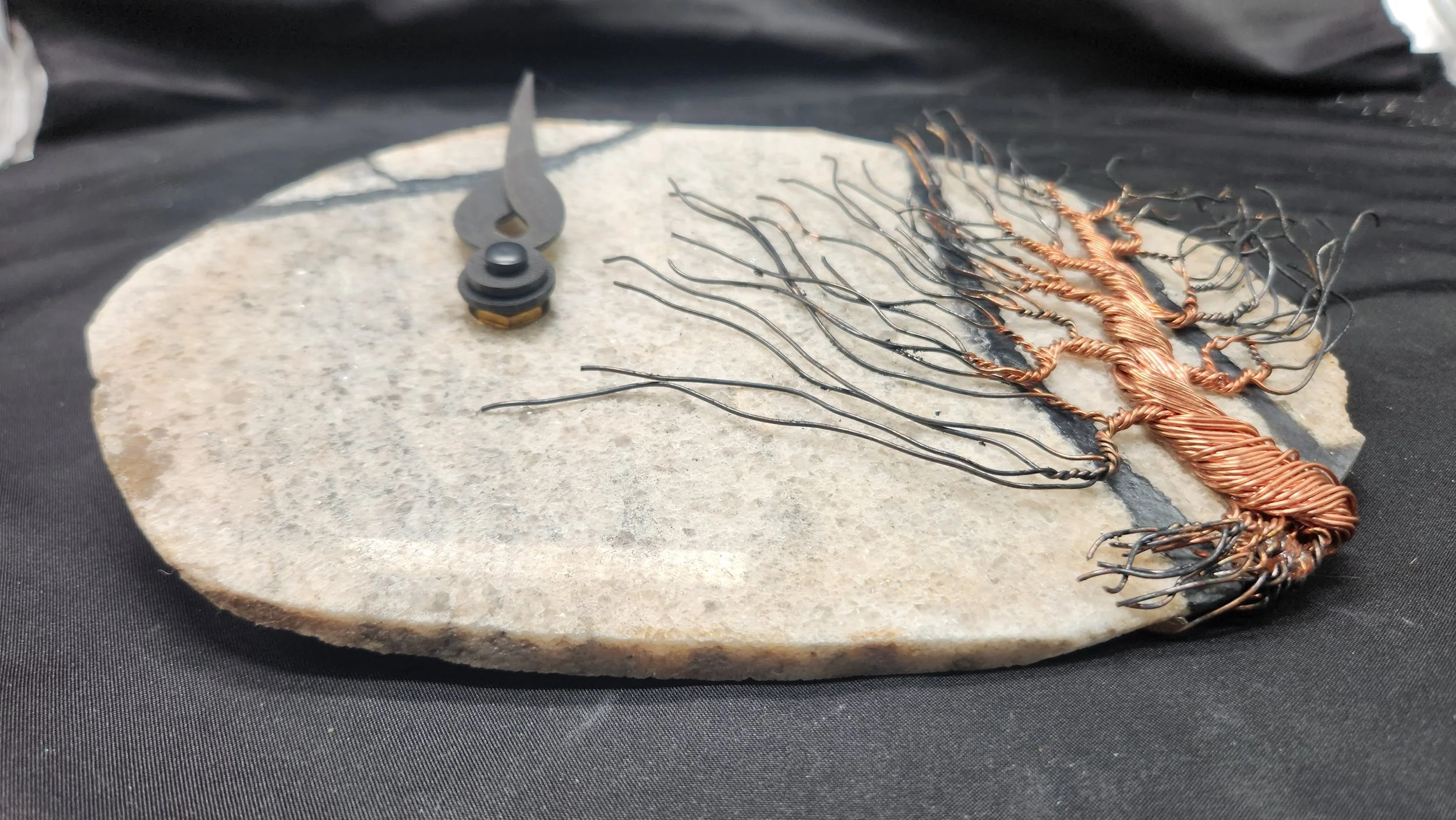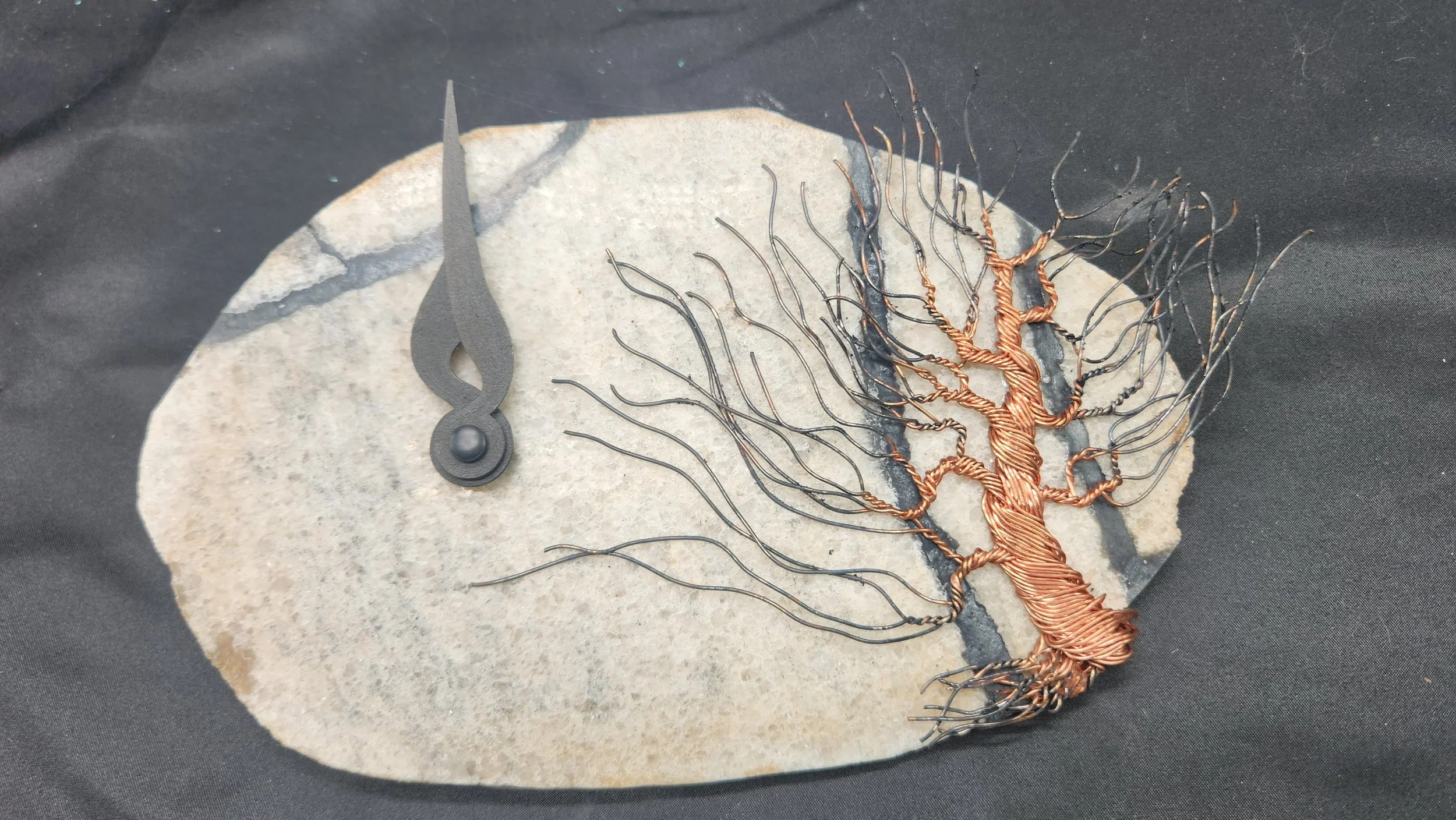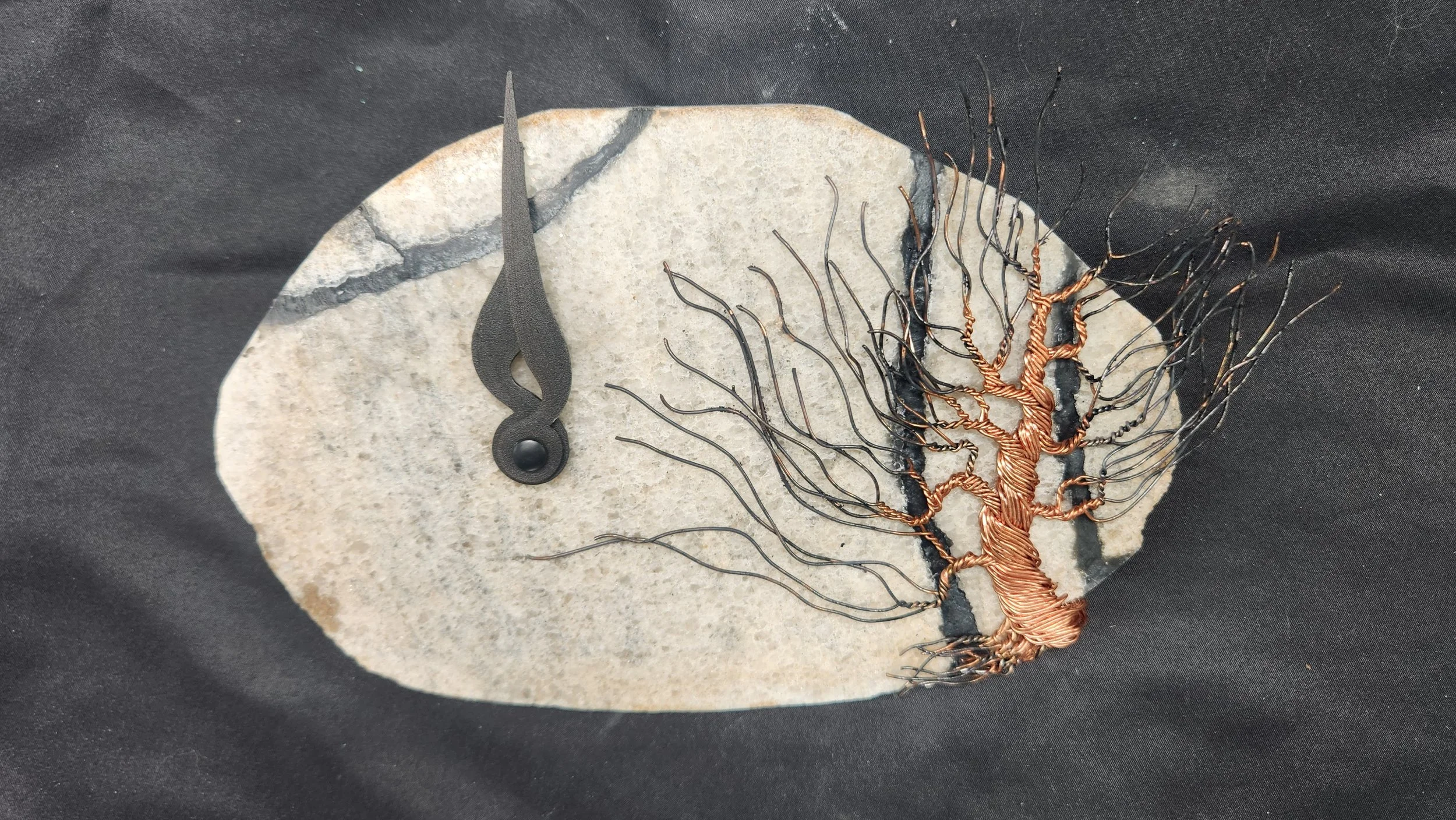 This light quartz slab broke cleanly into 5 pieces and I exaggerating the cracks by intentionally separating them and using black epoxy to give maximum contrast. and call attention to the repair in the kintsugi fashion. This 9.5” wide by 6” tall clock features custom Godwood "flame" shaped copper hands in black and a bright and shiny solid copper wire bonsai tree with liver of sulfur blackened baren branches.
