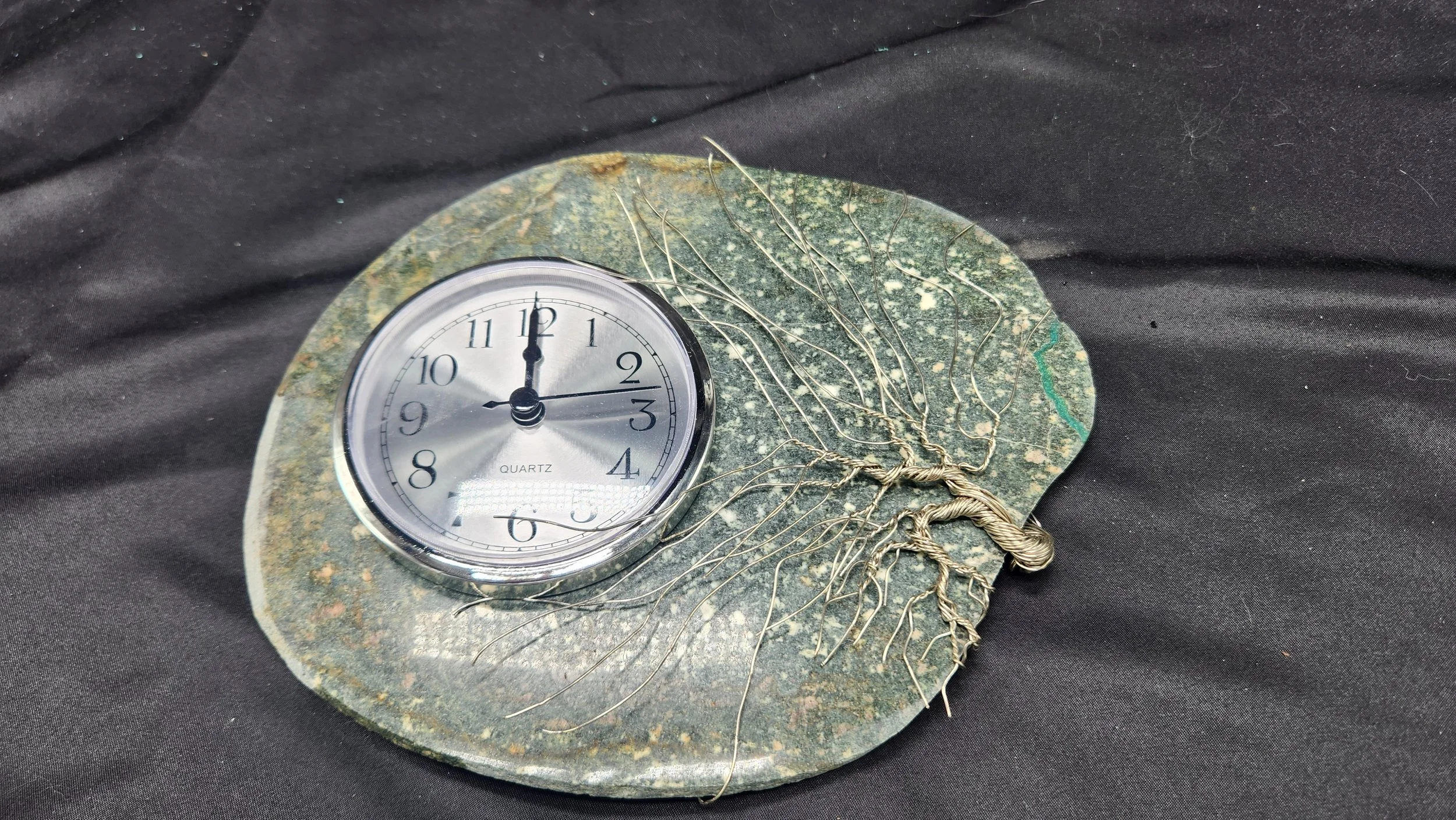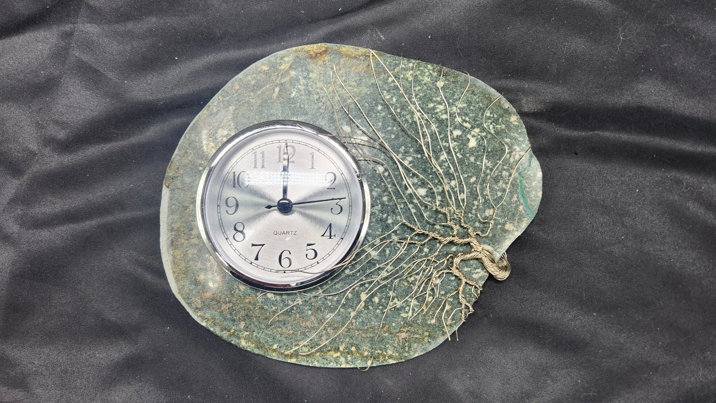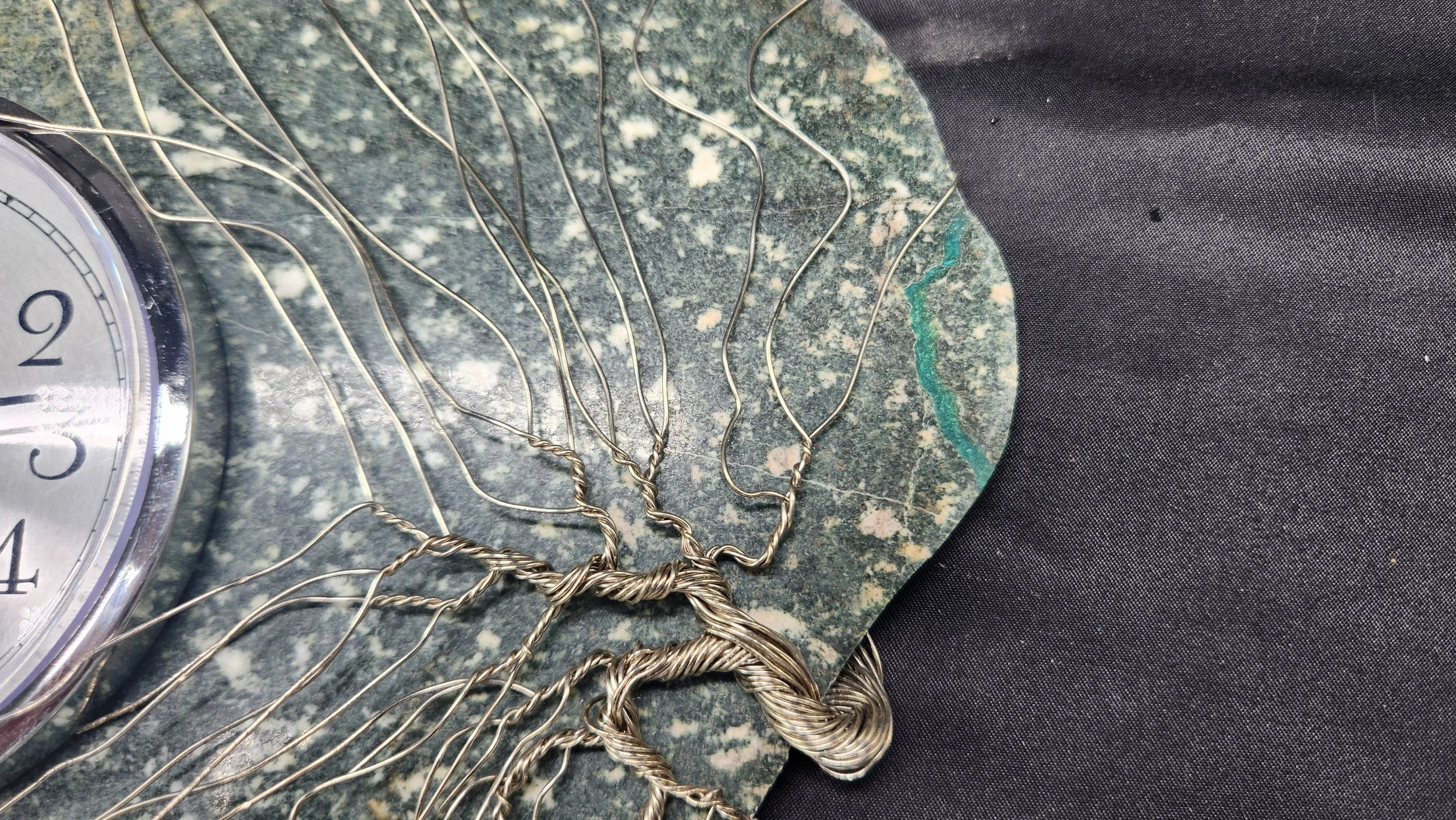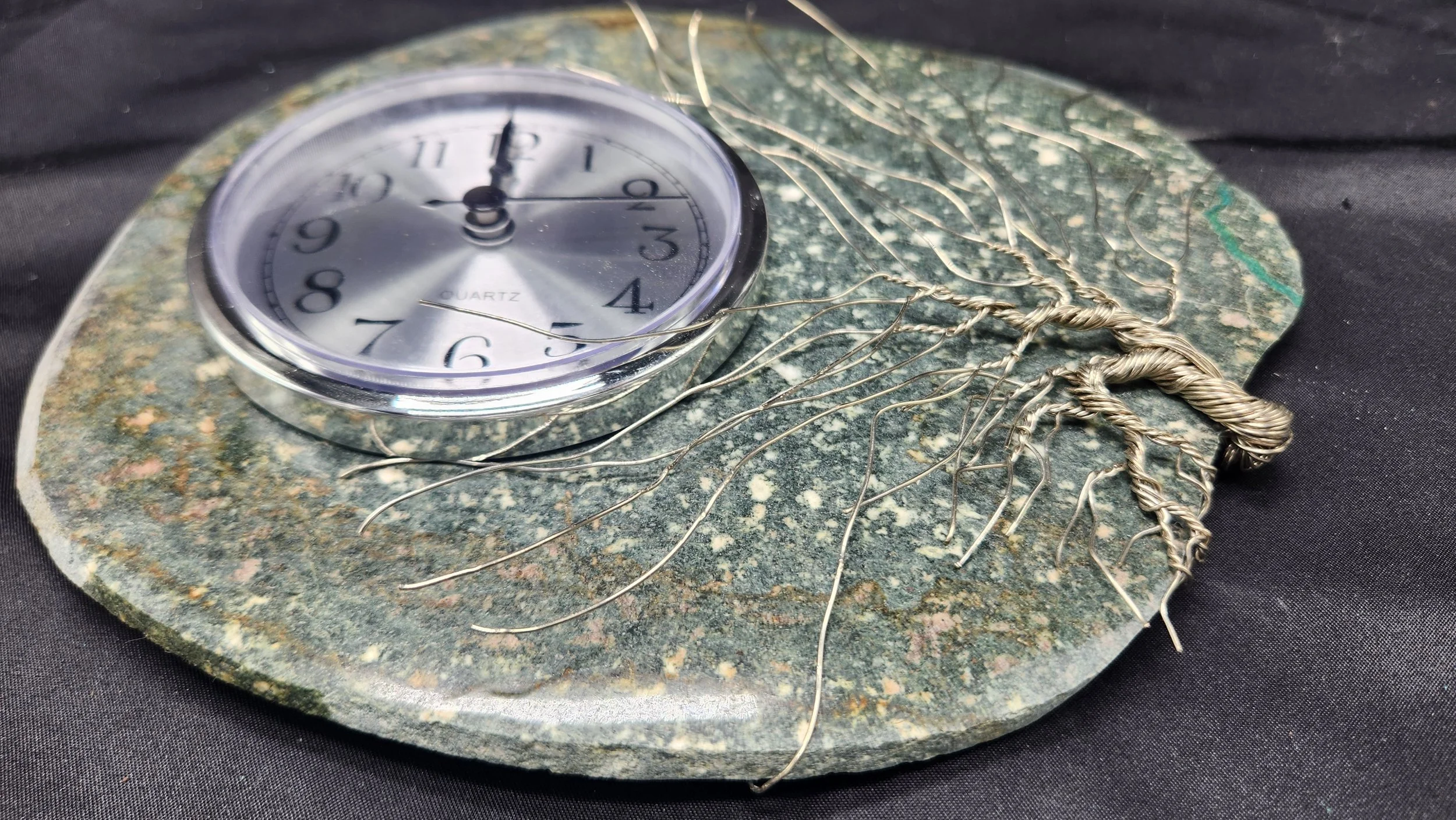 This slab made it through the crash with minimal damage and only needed a small repair to the right corner. I exaggerating it by intentionally increasing the width of the crack and filling it with bright blue epoxy to make the crack more visible. The result is a striking green speckled stone with an electric blue vein, measuring 8.25” wide by 7” tall. It features a 3.5” clock insert and a solid nickel wire bonsai tree on the right.