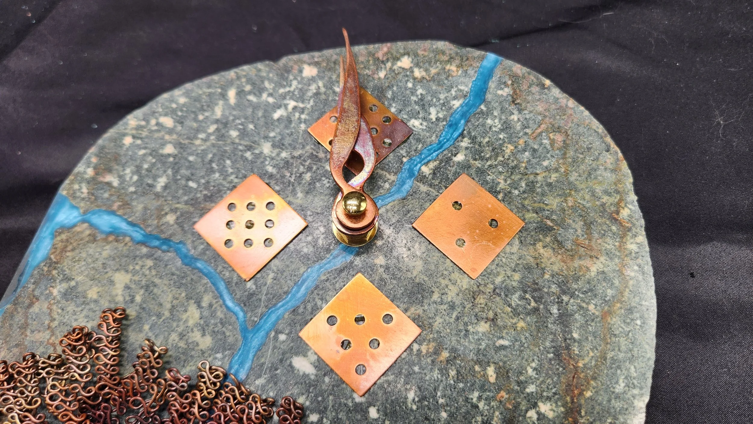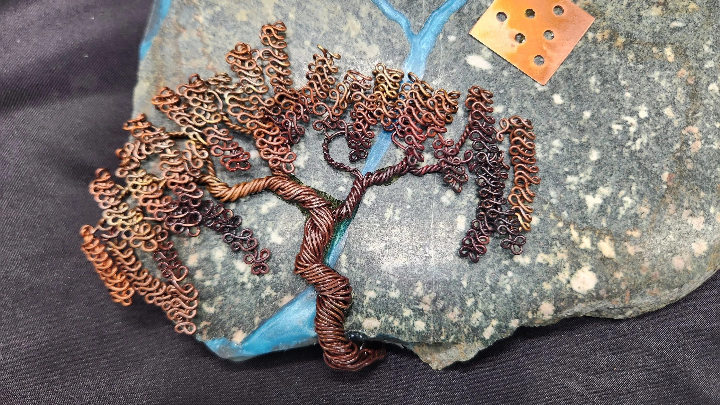 In this case the slab had broken into three main sections and I exaggerating the cracks by intentionally separating them and using a bright blue epoxy to make them more visible. The result is a striking green speckled stone with electric blue veins, measuring 8.25” wide by 7.5” tall. It features custom Godwood "flame" shaped copper hands and stylized diamond shaped copper numbers at 12, 3, 6 and 9 and a solid copper wire bonsai tree with weeping willow leaves sprouts from the blue at the bottom. The copper is flame painted to create beautiful color variation and depth. Flame painting is a unique art form that can take copper and transform it into a colorful masterpiece using a blowtorch to discolor the copper into many vibrant hues. Honestly, this is a far more beautiful clock with the Kintsugi repairs and it come with a story!