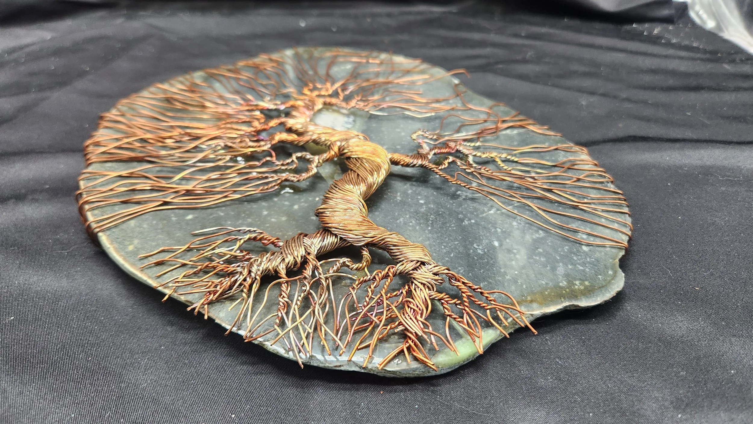 So here it is: my lemonade. Measuring 9.25 inches wide by 9.5 inches tall, featuring a shiny green stone flecked with white speckles, accented by a small light “moon” granite slice nestled in the center void. The swirling, pearl-colored epoxy flows through the cracks in true Kintsugi fashion, creating delicate veins that highlight the piece’s journey from rock to art. The large, pure copper tree with exposed roots is flame-painted to reveal its bright and colorful brilliance.