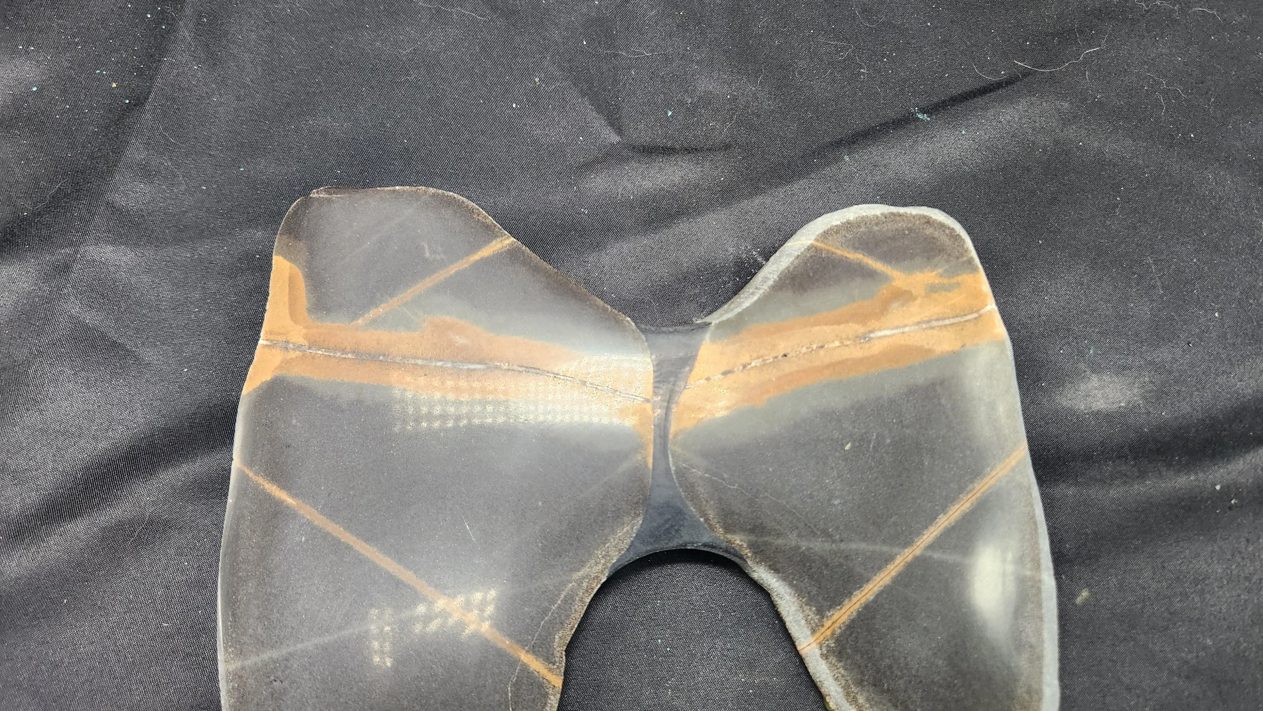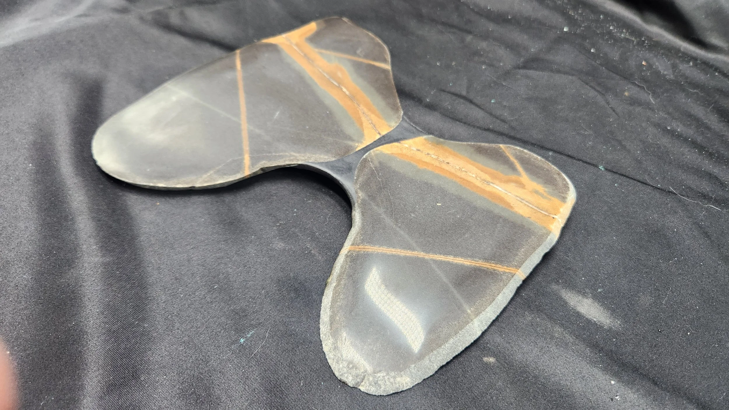Having grappled with this on another piece, I quickly came to the decision to make this into wall art. Bookmatched, this brown/grey stone has vivid lighter brown/orange veins with the largest vein traveling horizontally across with a crystal vein at its center. Attached at the center with dark grey epoxy, it has the rough shape of a butterfly, ending up at 7.25” wide by 6.25” tall.