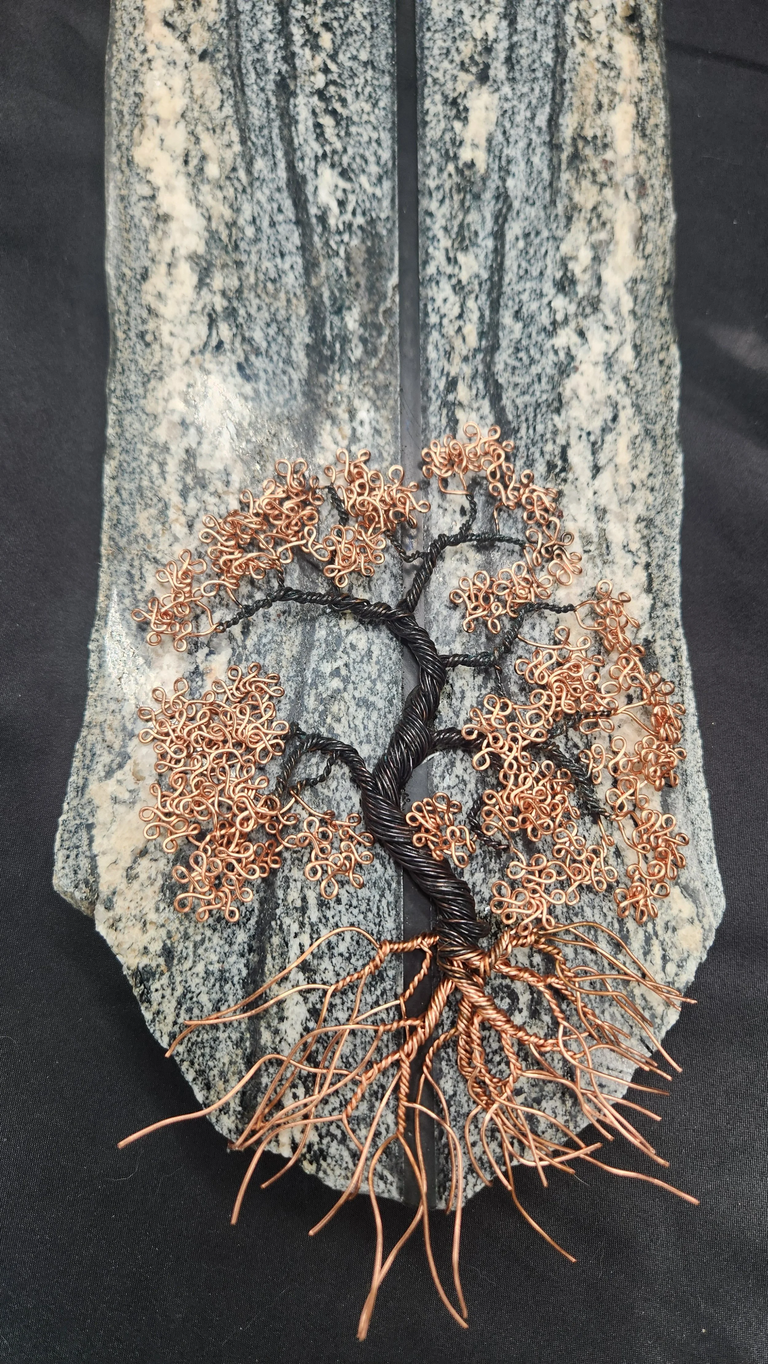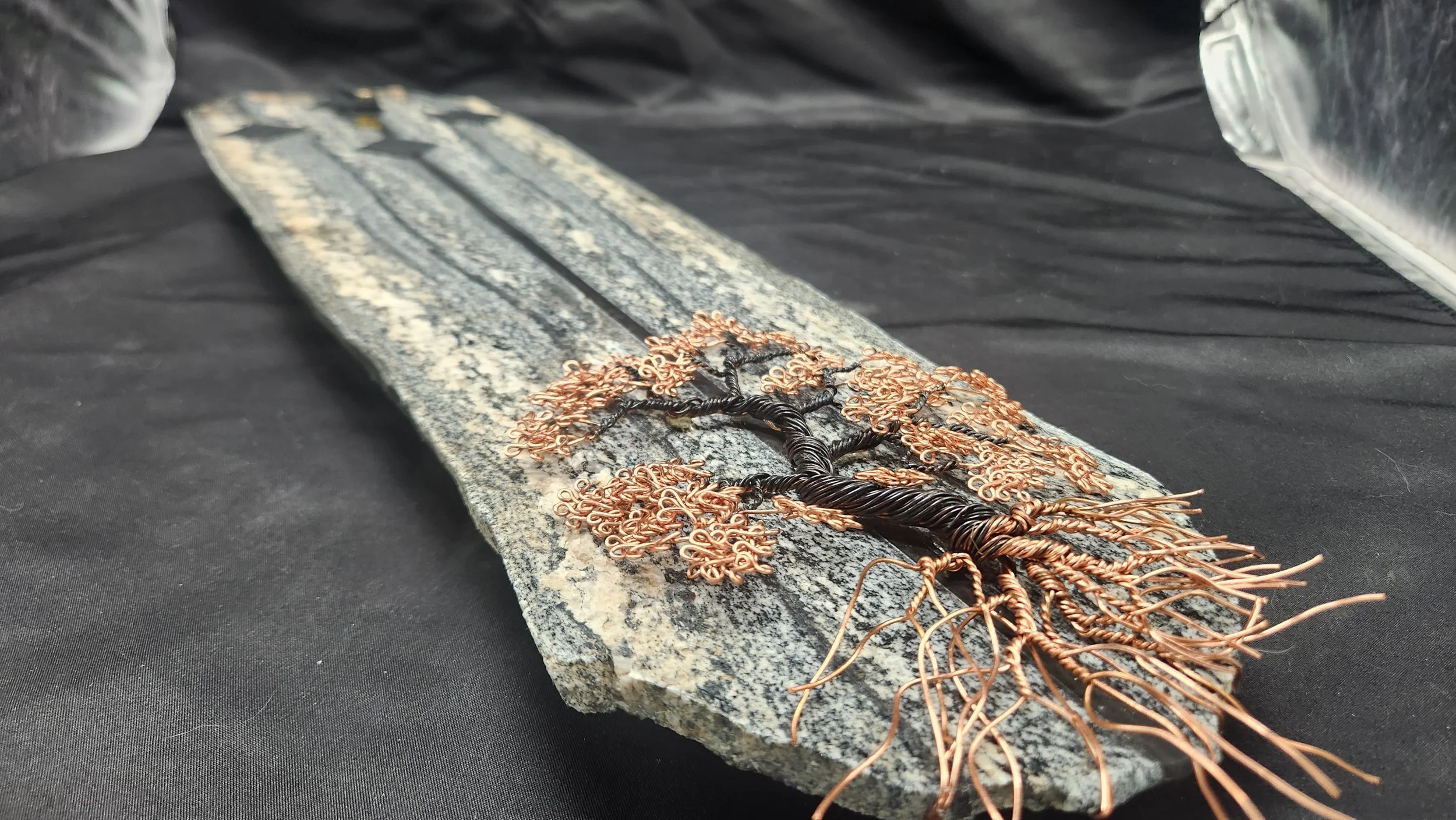 A solid copper wire bonsai tree decorates the bottom with bright shiny leaves and a liver of sulfur blackened trunk. The top of the clock features custom Godwood "flame" shaped hands and stylized diamond shaped numbers at 12, 3, 6 and 9, all black, balancing out the entire piece.