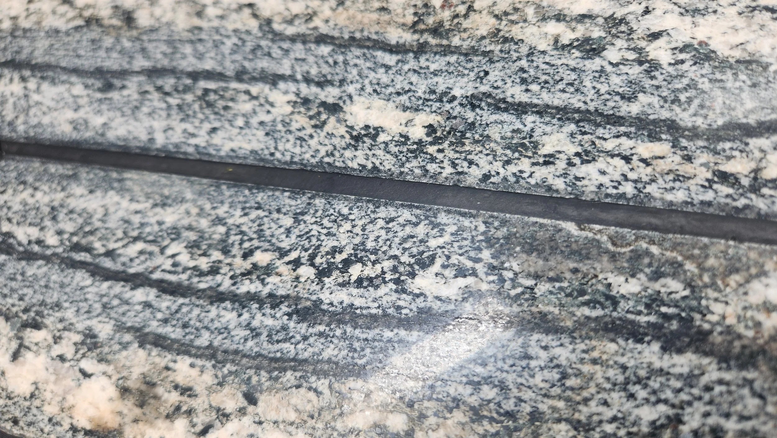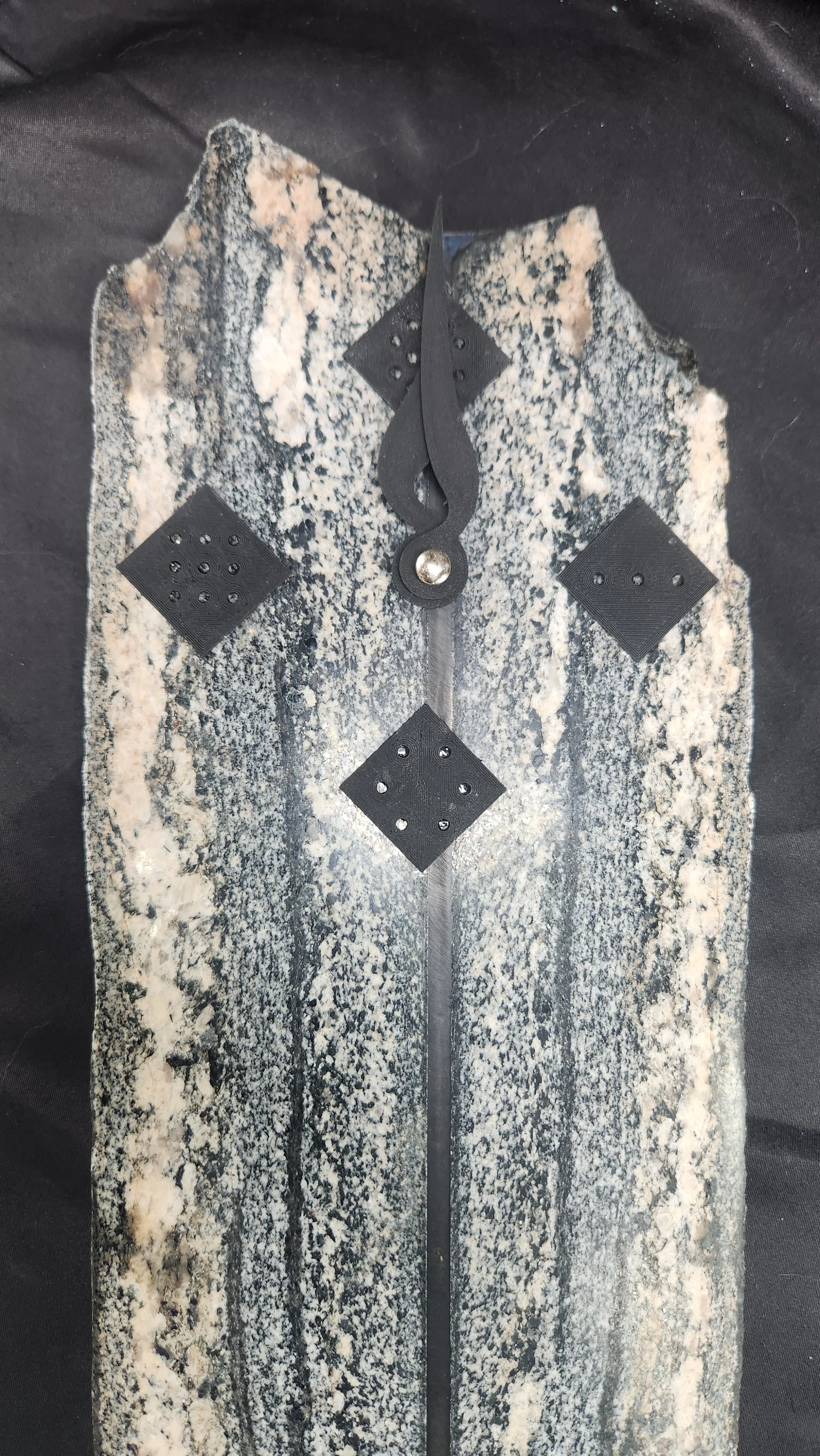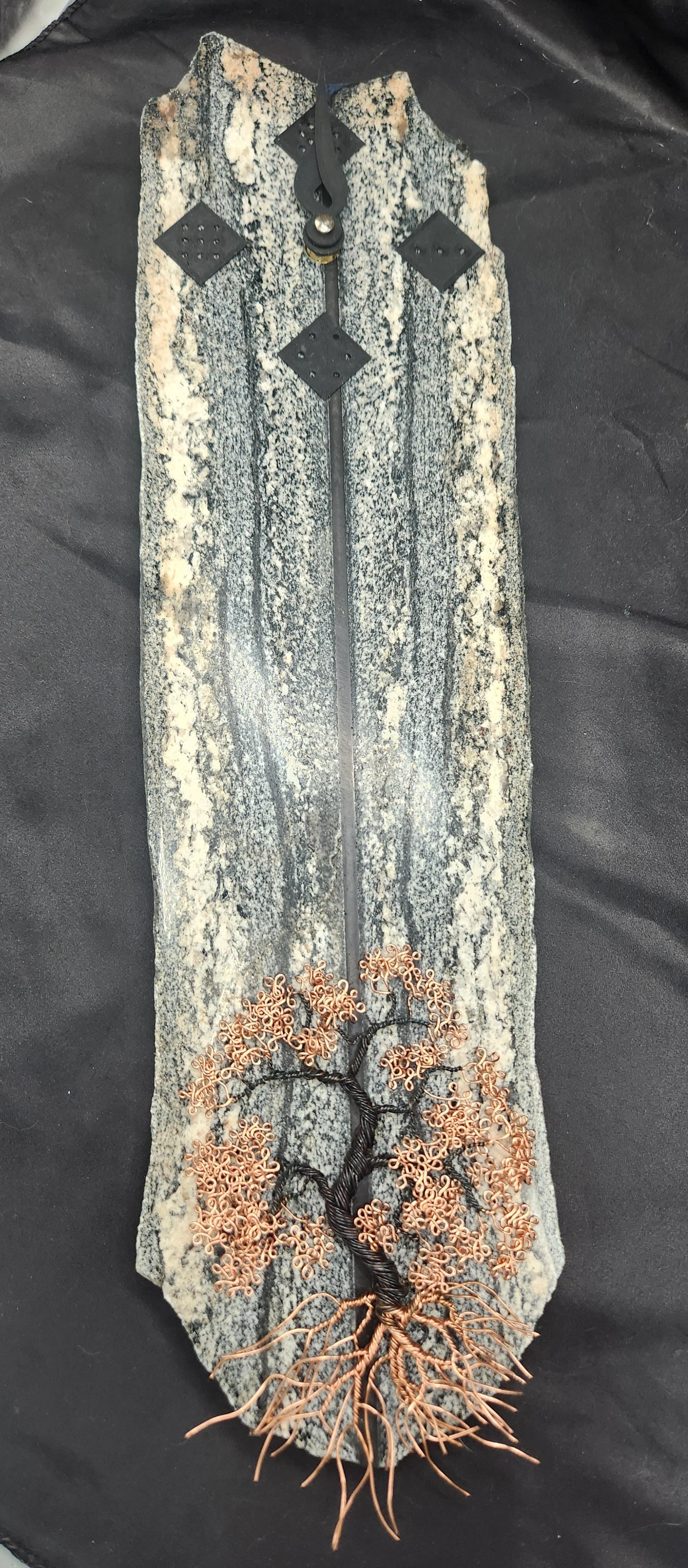 This clock was made from a stone I found here in western MA. Two slices from this live edge stone are bookmatched with a black epoxy strip between them. Bookmatching is a technique used in woodworking and stonework where two or more pieces are cut from the same, in this case, stone and arranged to create a symmetrical, mirror-like pattern. Imagine a stone being cut in half and then opened like a book. The stones are grey with heavy striated patterns of black and white quartz, polished to a high shine to create this 5.75” wide by 21.25” tall masterpiece.