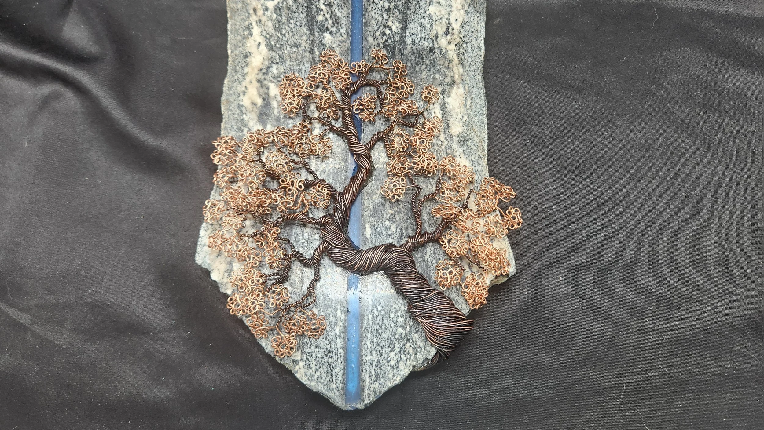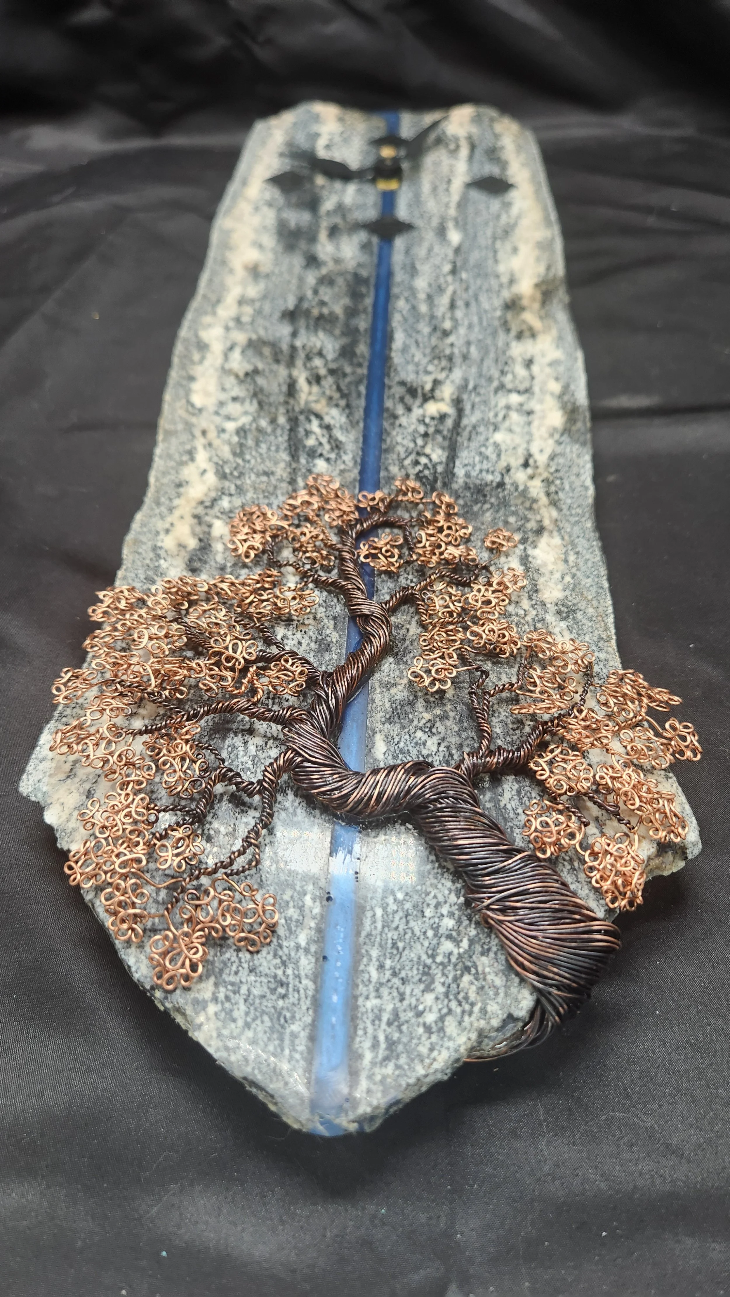 This clock features custom Godwood "flame" shaped copper hands and diamond stylized copper numbers at 12, 3, 6 and 9 in black. A solid copper wire bonsai tree sprouts from the bottom right corner with the trunk naturally blackened with liver of sulfur while the leaves remain a shiny copper.