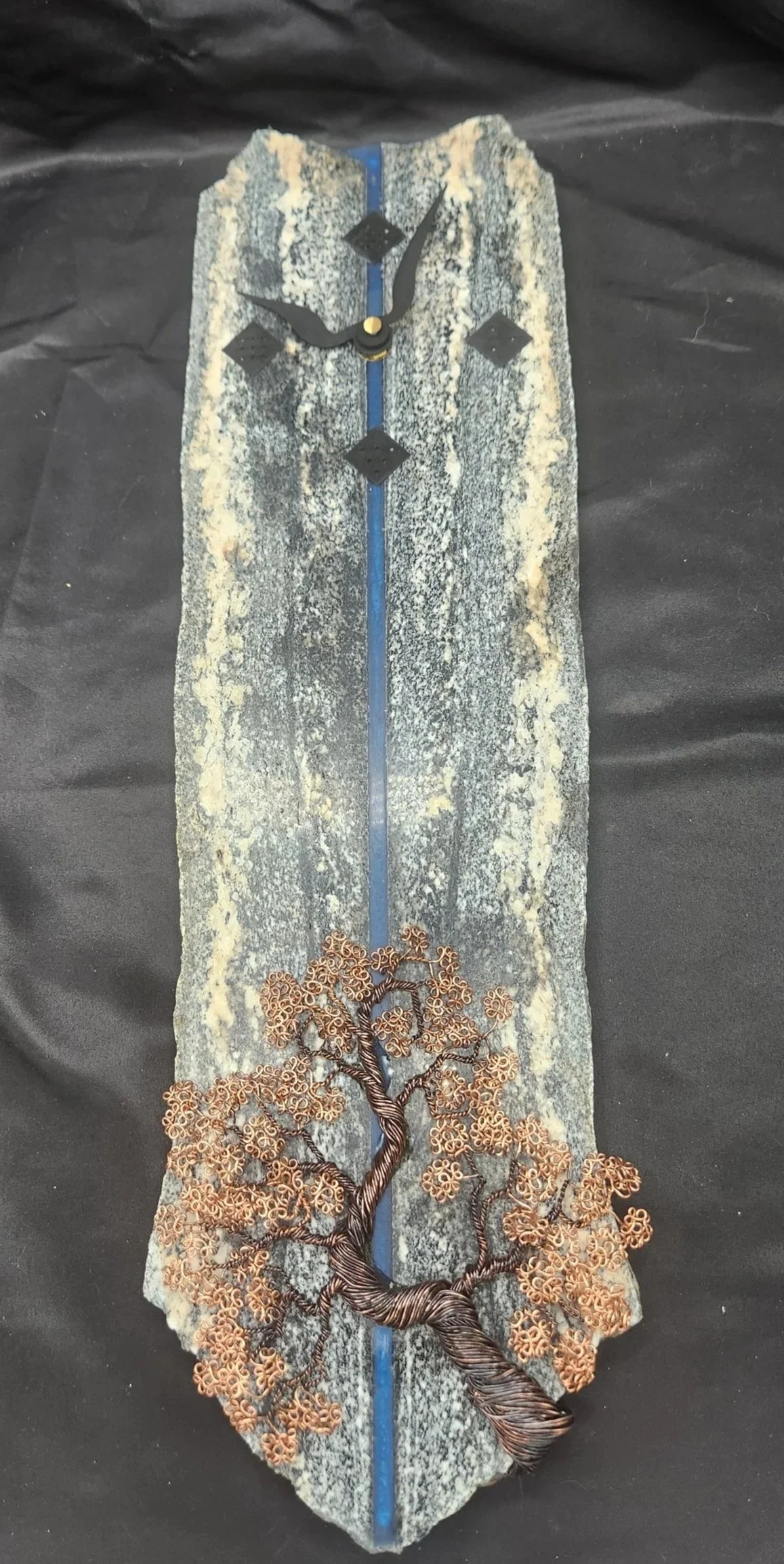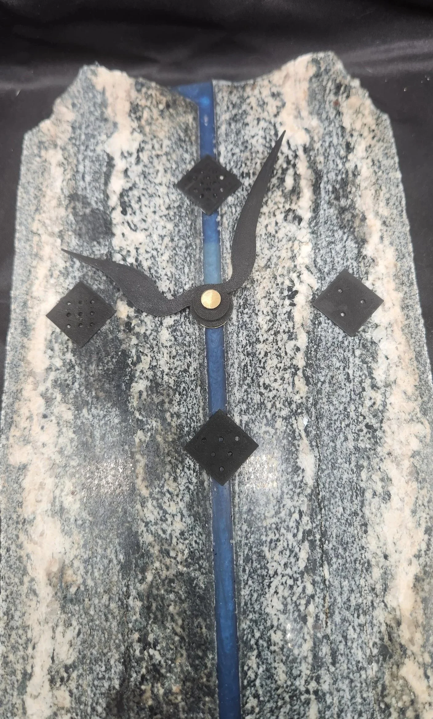 This clock measures 6.5” wide by 21.5” tall (16.51cm x .54.61cm). I found this stone in western MA and combined two slices to create this bookmatched slab. Bookmatching is a technique used in woodworking and stonework where two or more pieces are cut from the same, in this case, stone and arranged to create a symmetrical, mirror-like pattern. Imagine a stone being cut in half and then opened like a book. Running down the center is a brilliant blue stripe of epoxy adding color and contrast to the grey stones, speckled and streaked with black and white striations.