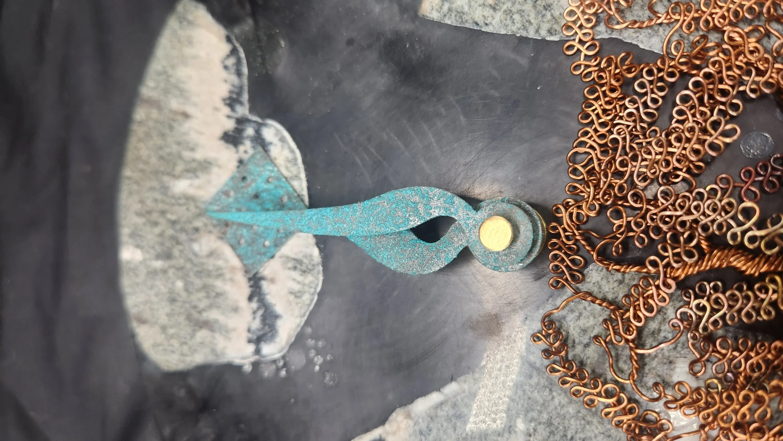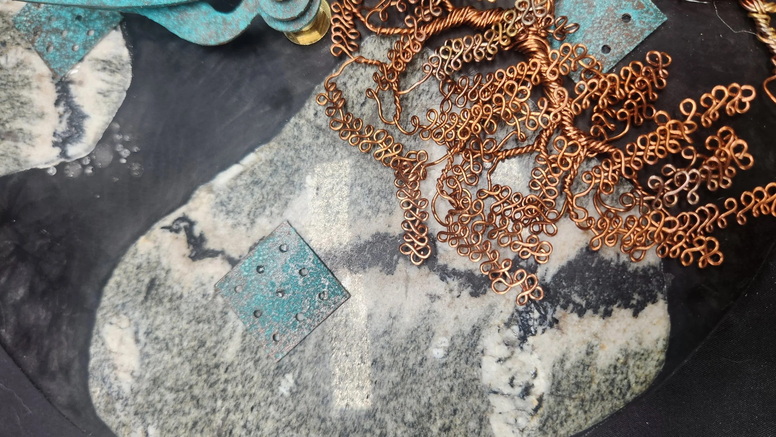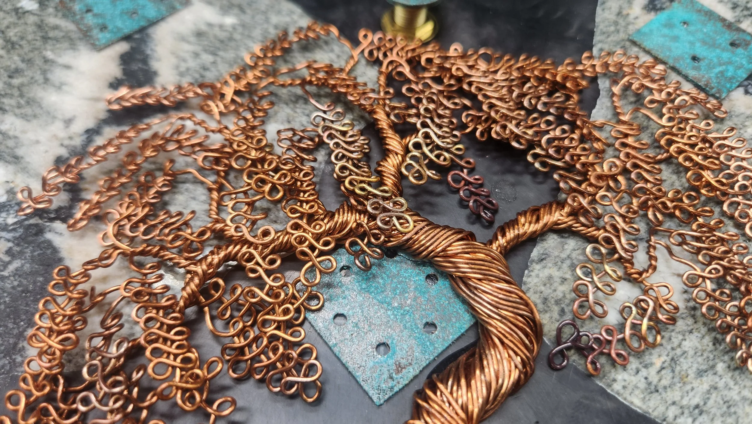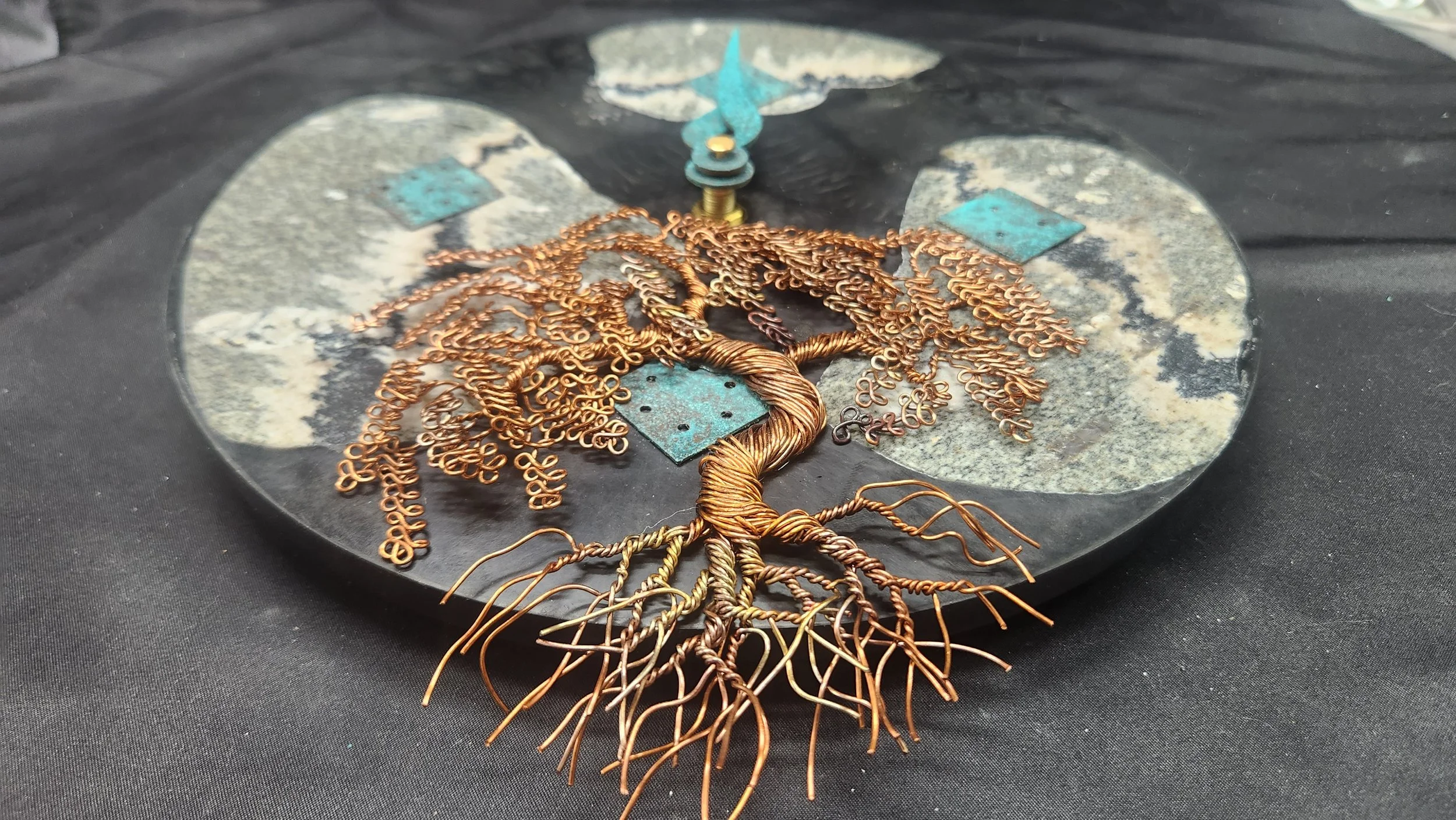 This clock features custom copper “flame” clock hands and diamond shaped numbers at 12, 3, 6, and 9, all with a blue/green patina. A flame painted solid copper bonsai tree strikes contrast on this piece with a weeping willow leaf pattern and exposed roots. Flame painting is a unique art form that can take copper and transform it into a colorful masterpiece using a blowtorch to discolor the copper into many vibrant hues.